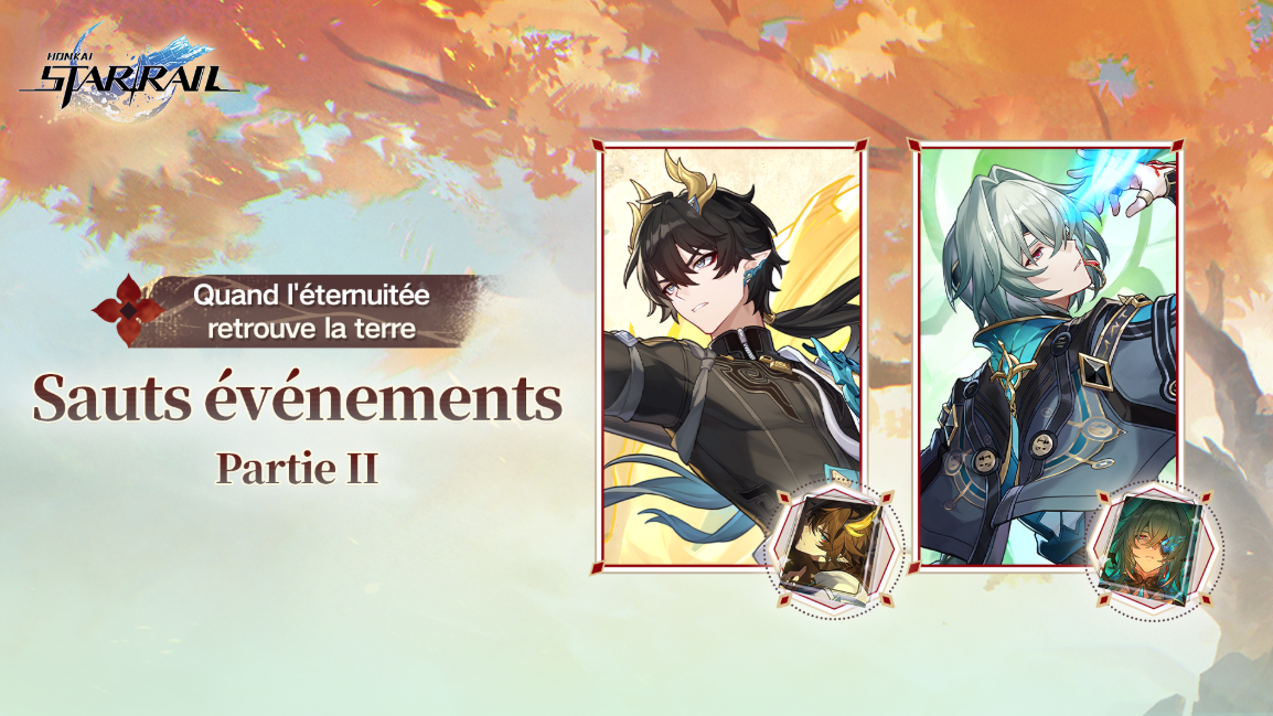Les chances d'obtenir les personnages 5 étoiles exclusifs Hyacine (Le Souvenir : vent), Castorice (Le Souvenir : quantique) et Tribbie (L'Harmonie : quantique), ainsi que les cônes de lumière 5 étoiles exclusifs Éternels soient les arcs-en-ciel (Le Souvenir), Des adieux encore plus beaux (Le Souvenir) et Si le temps était une fleur (L'Harmonie) seront augmentées. Cette phase de Sauts événements est disponible à partir de la mise à jour vers la version 3.7 du 2025/11/05 jusqu'au 2025/11/26 11:59 (heure du serveur).